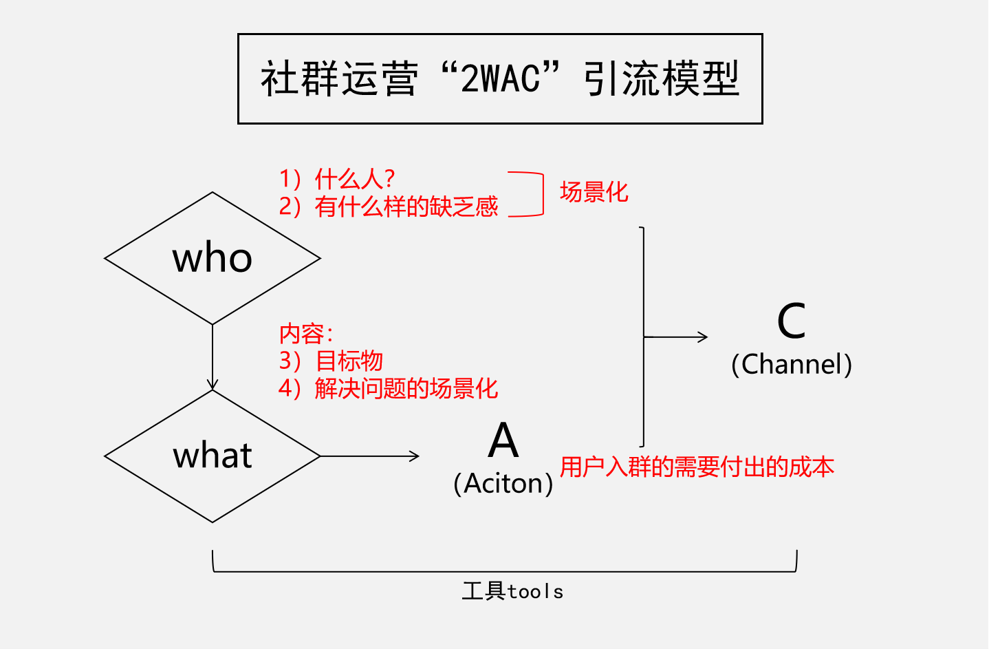 在社群引流阶段,我们要做的就是引发用户的关注。用需求三角模型来理解,就是整个社群引流部分,核心就是要想办法激发用户潜在的缺乏感。比如在明确WHO这个问题的时候,就是要先明确目标用户是谁,这类人会有哪些缺乏感,然后通过场景化的形式把它描述出来。之后WHAT就是我们能提供什么,这里的内容并不是讲清楚目标物是什么,而是让用户意识到,当他拥有了这个之后会有什么样的改变。通过前后场景化的对比,来突出目标物与缺乏感之间的关联性。