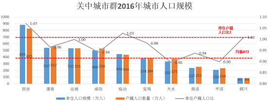 关中城市群10个城市人口基数均值为413万人。人口指数TOP3城市为:西安、渭南、咸阳。