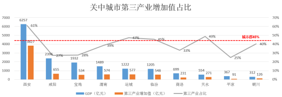 关中城市群整体第三产业增加值占GDP比重为45%,低于全国51.6%的平均水平;从产业发展潜力看,10个城市中,城市第三产业占GDP比重>城市群整体占比45%的有4个,为西安、运城、临汾、天水;城市第三产业占GDP比重超过50%的有1个,为西安。