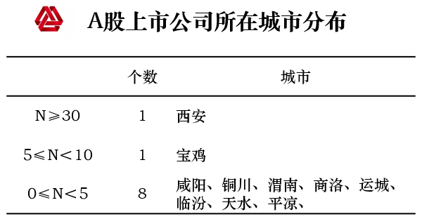 上市公司数量的多少是反映一个城市经济活力的重要指针。关中城市群A股上市公司数量相对较少,主要集中在西安;30家以上有1个城市,西安城市经济活力较强。