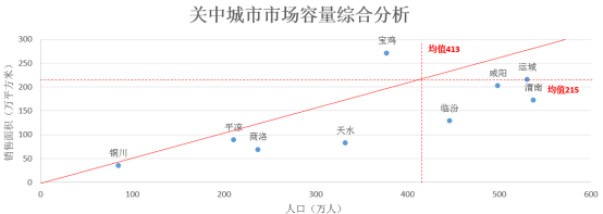 关中城市群城市市场容量基数均值为215万㎡ 。市场容量及安全指数TOP3的城市为:西安、宝鸡、运城。