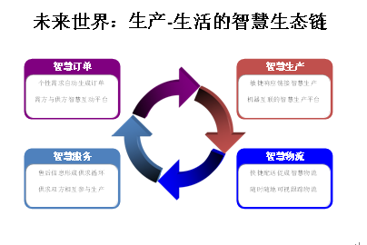 上述是一个完整的关于生产——生活的智慧生态链。未来各行各业都需要这种完整的生态链平台,当然也需要与之相连接的可以独立运营的智慧订单、智慧生产、智慧物流、智慧服务的平台。这是我们创业创新的方向。