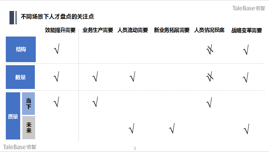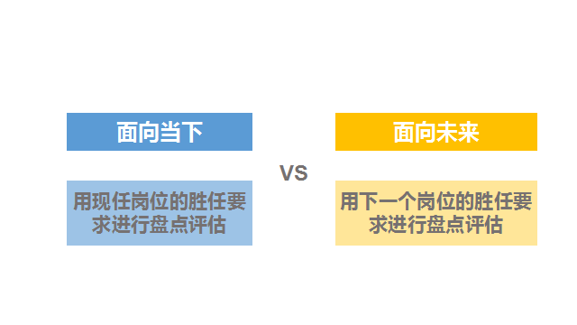 值得留意的是,内容侧重不同,尤其是对人才质量要求侧重的不同,盘点所使用的标准及评估工具都会发生相应的变化,这会在后面人才标准确定及人员评估实施的内容中进行讨论。