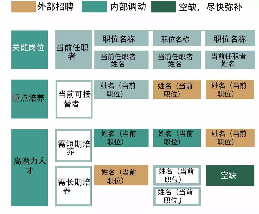 在安排继任计划的时候,主要候选人是九宫格里第一梯队的人才,并按其准备度进行划分(现在可接任、短期培养后继任、长期培养后继任)。