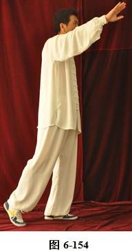 接上式,腰微拱成后坐式,重心落右腿上,右手臂随腰后拱向外旋转,回收至腹前,掌心斜朝上,随即含胸往上提腰,右臂往里旋转向前向上推出,重心渐渐移于左腿右脚跟提起,右腰往右外上提,左腰向左后下沉,同时右腰向右外旋转。两臂同时右臂向外旋转,左臂向里大旋转划圆,腰微拱,右脚跟随即向前向里移动少许落下;腰微微下沉,重心渐渐全部移落右腿,左腿成虚步。左臂外旋使掌心朝左,左掌随重心前移向前划伸至胸前正前方,左指上指, 掌心向右微屈,屈右肘,腰微含上提,右腕随腰向里提回,左掌翻掌下按,左脚略里收,前脚掌点地,成左虚步;腰向下沉,坐实右腿,右掌随沉腰向前下插掌,掌心向左。左掌弧形下落于左胯旁; 眼神前下视,观注下插的右手(见图6-154至156)。