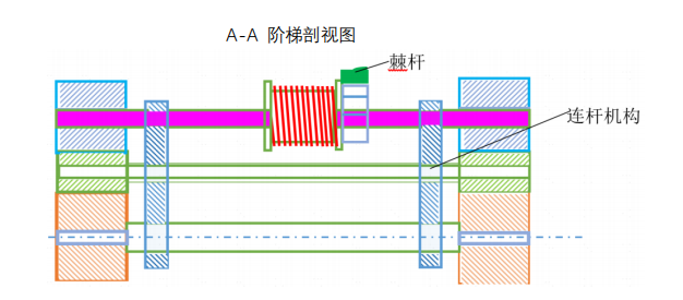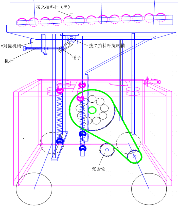 该装置右侧初始放置物料。当台车启动前行时,装置上的弹簧由初始间距较大的状态逐渐被压缩,直至密实。在台车行进与弹簧压缩的过程中,物料被逐步送至前方。台车的前进依靠齿轮与齿条的相互配合带动,而卸料环节则是利用弹簧压缩后积蓄的弹力驱动,使相关部件反向旋转,实现台车向后移动卸料 。