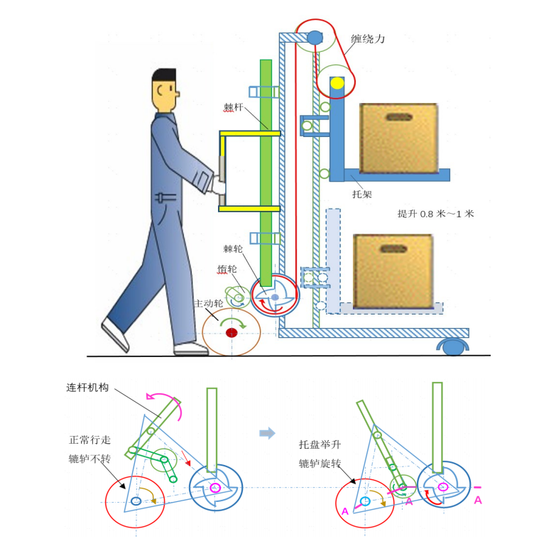 整个装置由连杆机构带动两个轮子(主动轮和棘轮)及一个舵轮,舵轮的作用是防止装置自动往下倒,当抬起把手,推着车往前走,下压时轮子停止。