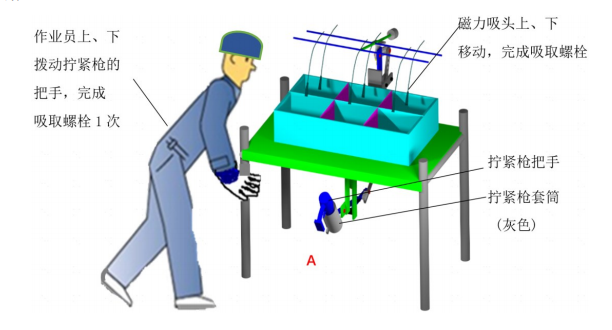 这样一来,工人在放回枪的步骤中,既没有浪费动作,又能抬起三个不同螺母,完成 “拿起枪拿螺母装配→放回枪时获取新螺母” 的动作循环,省去了原本装完后放回枪再去捡螺母的环节。