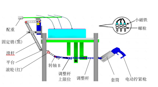 装置采用杠杆机构,当工人将拧紧枪放在右边并移动枪把手时,杠杆机构会带动探头上下运动。探头往下走时吸取螺母,往上走时将螺母吸起,此时工人用手一拿,就能拿起三个不同的螺母。