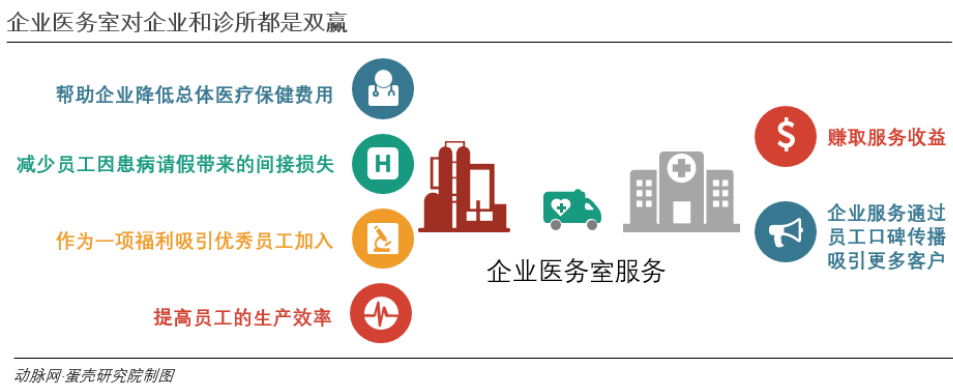 大型企业都有很强的医疗保健需求,诊所可以考虑通过承接企业的医疗保健需求,在企业内部做医疗服务,入驻企业,并在企业内部培养潜在的个人用户。