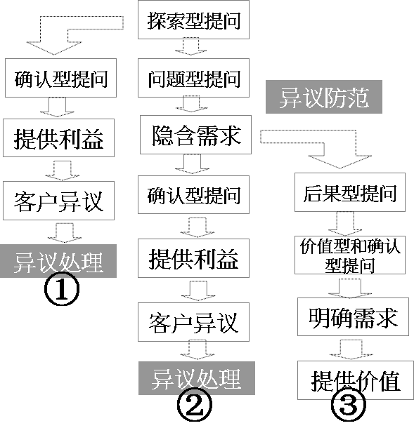 用策略性提问是应对客户异议最有效的方法,但是我们仍然会收到客户的各种异议,当产品同质化、客户需求也很明确、你提供的产品与客户的需求不相符、竞争对手有明显的优势,尤其是你只是提出问题而没有提醒客户问题的严重性的时候,需要使用应对客户异议的第二种方法——异议处理(见异议防范和异议处理图①和②)。