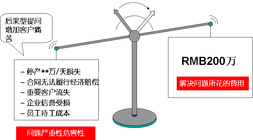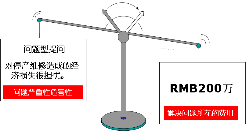 点评:销售顾问确实指出了客户的问题——使用现有的窑炉维修方法在生产高峰时会带来麻烦,客户也表示认同。不过客户认为问题不严重,还没有到非解决不可的程度,不值得花这么多钱。因为销售顾问没有提醒客户问题的后果和严重性,过早提出了解决方案,所以,当客户觉得解决问题所花的成本大于停产维修造成的经济损失,客户一定会产生价格异议(见价值天平图1)。