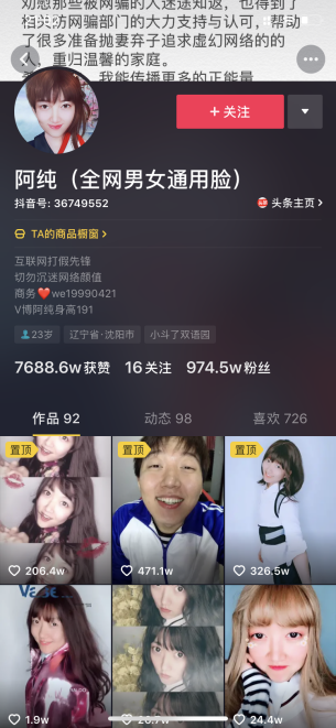 比如“多余和毛毛姐”,一个男生同时扮演男女两个不同的角色,自己与自己进行对话和沟通,没想到女版人物比男版人物更受粉丝欢迎。抖音账号“乔万旭”,主播也是一个人扮演多个角色,很受欢迎。抖音里很多男生化妆变美女的视频,都很受欢迎,比如“阿纯”。动物与人的角色互换,代表账号是“会说话的刘二豆”“金毛蛋黄”等。语言模仿,参考“张大仙”。角色扮演的账号如图5-18所示。