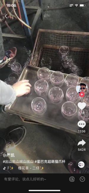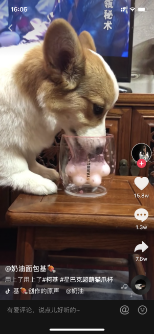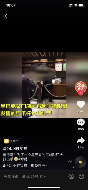 关联创意,俗称“蹭热点”。星巴克猫爪杯突然在网络走红,有客户为了购买限量供应的猫爪杯大打出手,全网轰动。很多抖音账号于是借助猫爪杯的热点,进行关联创意,视频火爆,如图5-19所示。