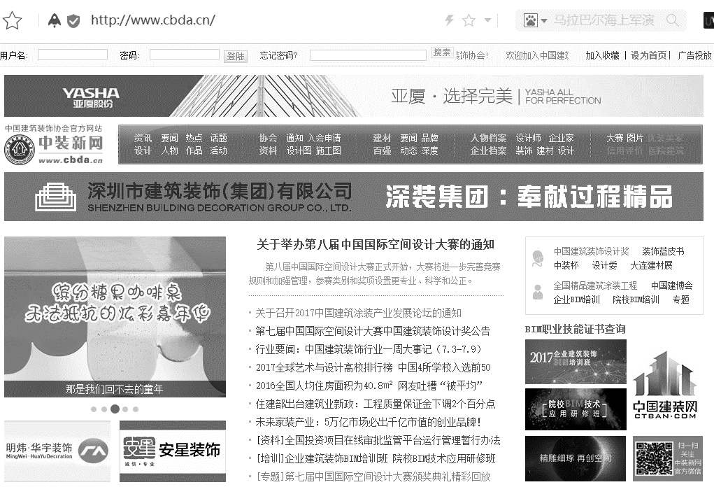 我们在各大综合门户网站(新浪、网易、雅虎等)和行业门户网站(如装修协会网站)上看到的各种图片广告就是网络媒体广告。根据所在网站的知名度大小和浏览量等,广告费也会高低不一,像国内的一些大网站,其广告费用甚至比电视广告费用还高。一般都是一些知名企业和高利润的企业会在上面花钱做广告。我认为,这类广告适合大公司做形象广告,或是有新产品推出时做一阵广告,产品主要是以个人日用品为主。这种广告的优点是立竿见影,只要做广告立刻就能收到效果,缺点就是费用高。中小企业不适合采用这种方式,应当关注一些行业内的门户网站(如建材公司可以关注中国装修行业协会网站),这些行业网站的规模比较小,影响力相对较低,广告费用也会低得多,但对于行业内的宣传特别有效。如图1-4所示,中国建筑装饰协会的官方网站首页上布满了广告。
