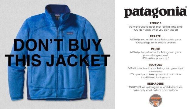 美国户外运动品牌巴塔哥尼亚(patgonia)的员工提出了不同的问题:“如果我们让消费者不要购买我们的产品,会有什么效果?”于是,他们在2011年感恩节后的第一个星期五,即“黑色星期五”这一天,在《纽约时报》上用整版刊登了一篇广告,广告上是一件巴塔哥尼亚的摇粒绒夹克,上面写着“不要买这件夹克Don’t Buy This Jacket”。