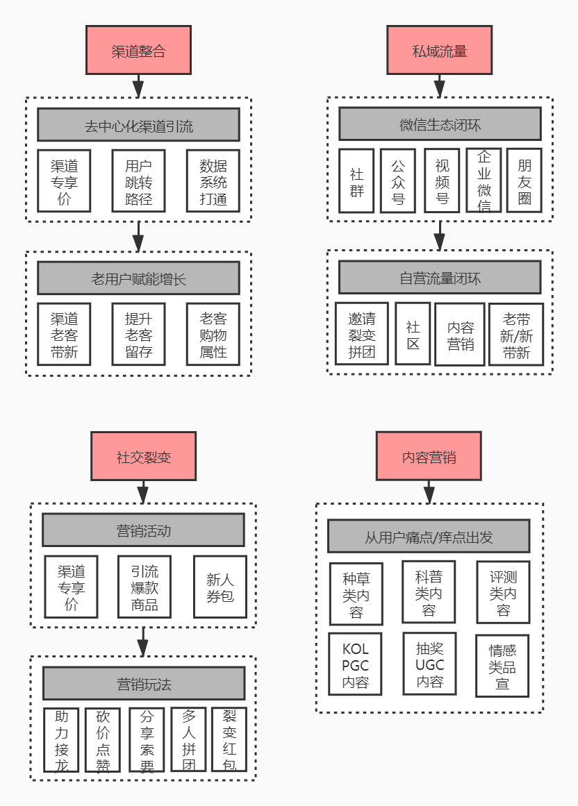 一方面促销式的获客,例如拼团,这部分促销式获客控制点可以增加多个维度来提高增长系数、拼团的人数、商品的促销梯度价格。两人拼团,每人实付价9.9元;三人拼团,每人实付价7.9元,以此类推,通过价格导向来引导老用户拉动新用户。