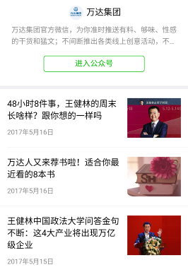 如“万达”公众号发王健林发言、万达工作法,还有“经纬创投”的“经纬低调分享”。一个直接,一个委婉,我们需要根据自身水平去借鉴尝试。