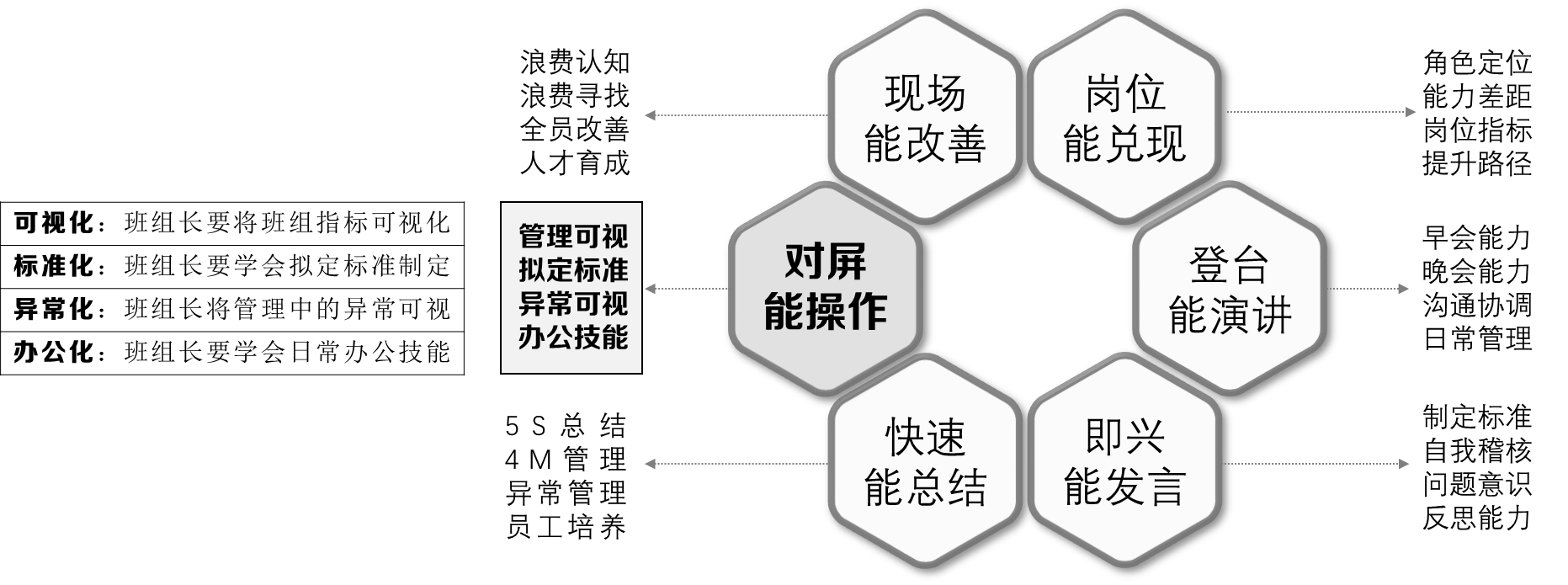 对屏能操作:基层班组长在班组长这个岗位上,必须要具备让现场的管理要素可视化,通过可视化来发现问题点,进而去改善。所以,这个“屏”指的是管理要素可视化。丰田大野耐一说过一句话:可视化是改善的起点。如果班组长不能够在现场看到正常与否,何谈改善呢?没有改善?何谈能力提升呢?当然,这个“屏幕”也包括日常办公软件的学习,掌握办公软件核心的重点技巧,以便班组长日常总结使用。