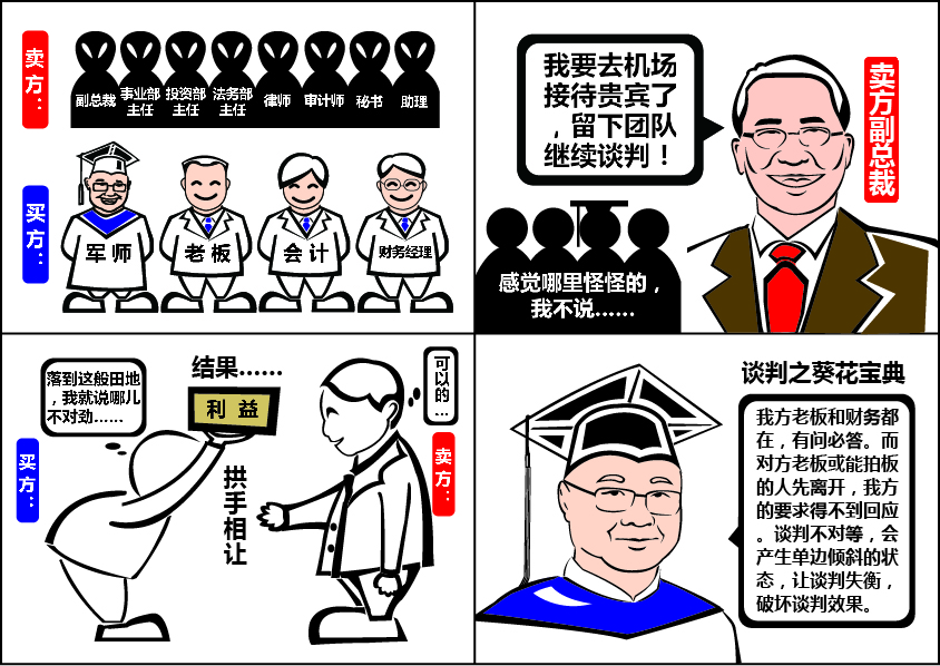 有一次,笔者陪着客户进行并购谈判,对方阵容可谓豪华,而副总裁却提前离开。一开始大家并未觉得有何不妥,结果当天下午的谈判我方做出了非常多的让步和承诺,反过来我方所期望的承诺没有得到对方任何实质性答复响应。送走对方谈判团队后,笔者团队留下来小结,才发现了实质性的问题:当天谈判的级别有问题,对方谈判团队都是中层和外部专家组成,却没有决定权,所以我们的要求无法得到响应;反观我方团队,人员不多但有老板和财务参加,面对对方团队提到的实际问题,如果不回答则显得我们没有诚意、有意隐瞒;如果回答了,就等于做出了承诺被写进谈判备忘录。如图9-4所示。
