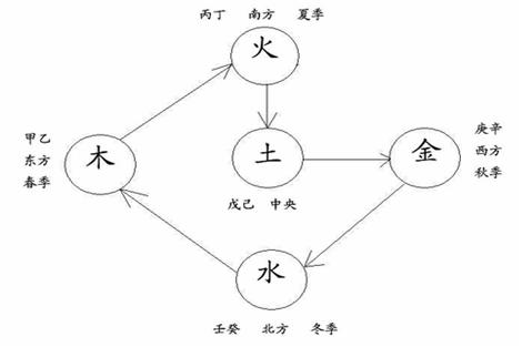 “五气顺布,四时行焉”。四时指的就是四季。正是因为有了五行之气的变化,才会产生春夏秋冬四季的交替。如果我们将阴阳五行的学说,和一年四季、东南西北的方位,还有天干地支结合起来,就可以形成以下的一些基本概念,比如说东方甲乙木,代表的是春天;南方丙丁火,是夏天;西方庚辛金,代表的是秋天;北方壬癸水,指冬天;中央戊己土,分属四季。如下图:
