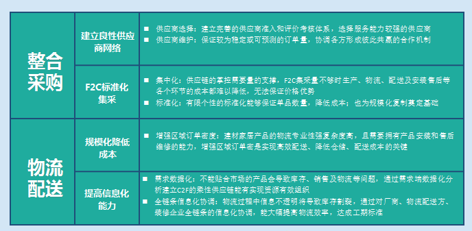 我国建材行业流通过程加价率高,各级分销商层层盘剥大大增加了供应链环节的沉淀成本,能否建立稳定有力的供应链壁垒是互联网家装企业控制成本的关键之一。此外,装修过程中涉及到的主辅材品类繁多,其中包含很多定制品、非标品,施工过程中材料入场时间及顺序对装修工期影响大,没有强大的供应链管控体系调拨将大幅增加装修过程中的不可控因素。家装供应链在采购、物流等层面痛点颇多,F2C集采、信息化是互联网家装企业提升供应链实力的主要手段