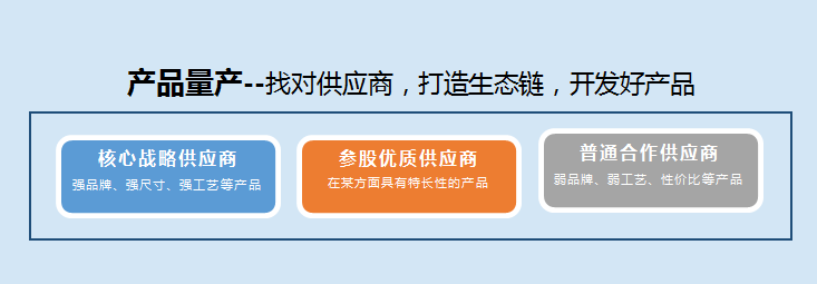 2、对于强品牌背书的品类,(1)联合出品的方式(参股优质供应商--共同利益);(2)自产(核心战略供应商--共同命运)