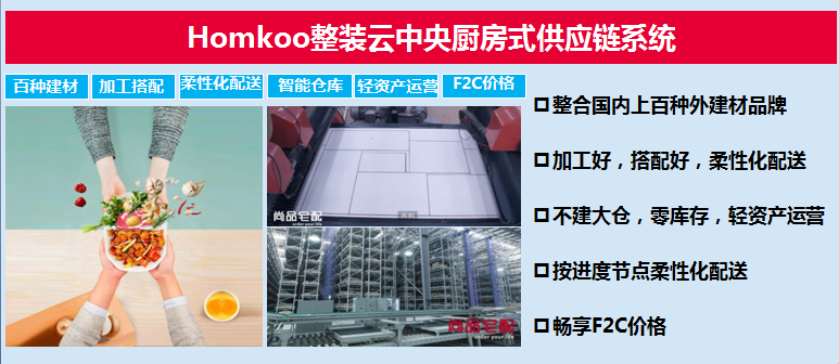 Homkoo整装云中央厨房式供应链系统--四大能力:(1)核心采购综合能力;(2)11000+SUK管理供应能力;(3)个性化产品规模化生产能力;(4)柔性化物流配送能力。(5)整合国内上百种外建材品牌。(1)主辅材、定制家具、配套品供应链平台;(2)3300+SKU,满足一体化采购需求。而这个规模仍然在扩大。