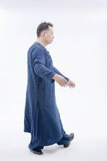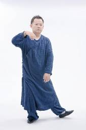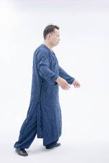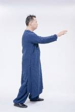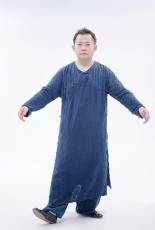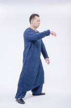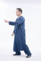 8.左脚踩下将重心平移至右脚心,同时左手画半圆至左胸前,松肩垂肘,左肘不超过肩膀高度,右手松掉护裆于右腿内侧。