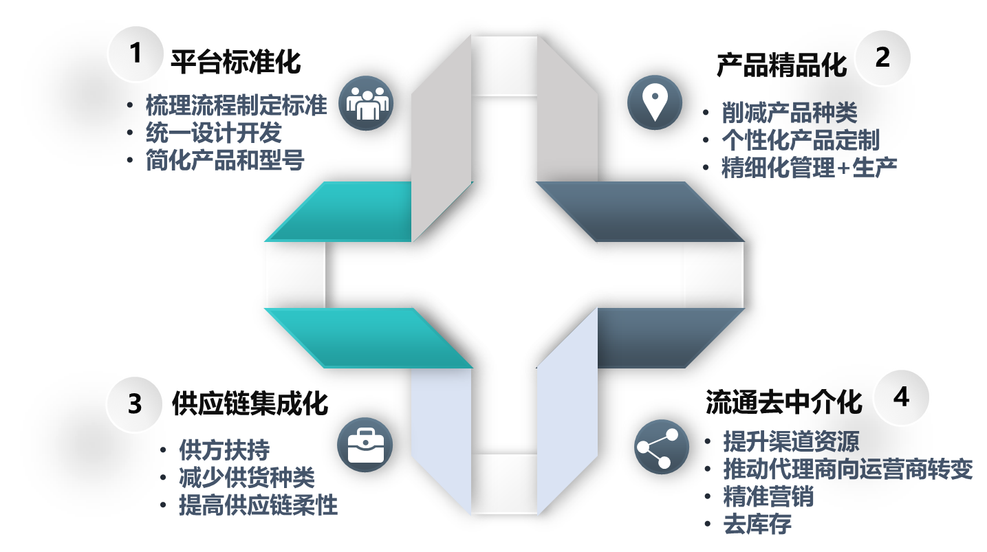(1)产品设计与技术平台标准化,新产品进行统一设计与技术开发,使得技术标准、基础配件及模块得以统一,也提高了供应链整体运营效率;