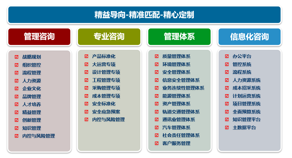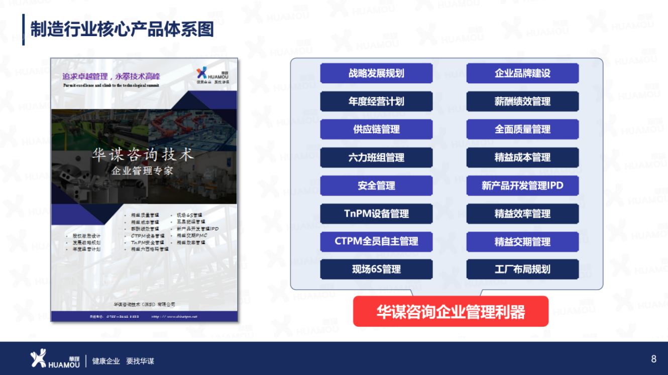 华谋咨询为客户提供管理咨询+信息一体化的专业服务,拥有原创的管理理论体系及经过数千家企业实践提炼的管理技术,形成十大咨询方向:基础管理增值系列、生产增值系列、供应增值系列、营销增值系列、人资增值系列、财务增值系列、研发增值系列、运营增值系列、战略增值系列、其他增值系列。华谋咨询股份服务领域涵盖全部十大行业:采矿与冶金行业、化工与原料行业、食品与包装行业、家居与休闲行业、电子与电器行业、机械与设备行业、交通与运输设备行业、能源与建筑行业、传统服务业、现代服务业;以研究非自然生命体发展周期的十个阶段为对象,为非自然生命体可持续健康发展、提供全方位一体化第三方技术服务。