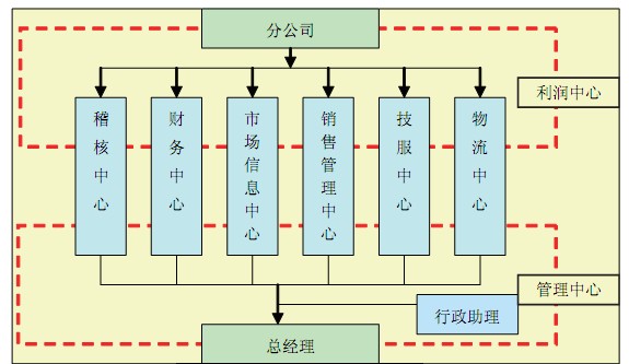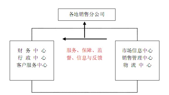 分公司直接面对市场,实施市场策略,反馈市场信息,完成各项任务指标;六大中心是分公司强大的支持保障系统,对分公司提供市场策划、信息支持、物流支持、决策支持以及各种相关的后勤保障支持;总经理对分公司的管理一部分通过六大中心来实现,一部分通过直接管理来实现。