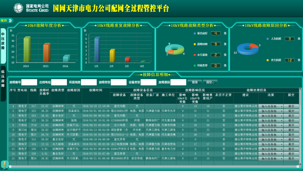 班组4.0项目充分利用大数据技术,对故障案例进行了整理和分析,以中压故障为例,班组微应用平台将重复故障、故障类型、原因进行统计,对单条故障的故障信息、故障设备台账信息、负载率情况以及影响用户情况进行多维度分析。