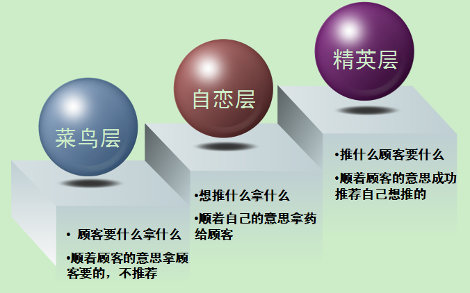 第三层:精英层。一些药店人开始不断优化自己的技巧,最后少部分人会进入这一层级。他们在导购时,推荐较易成功,其准则往往是顺着顾客意思,但最后却能成功推荐自己想推的产品,这个过程充满智慧与技巧。
