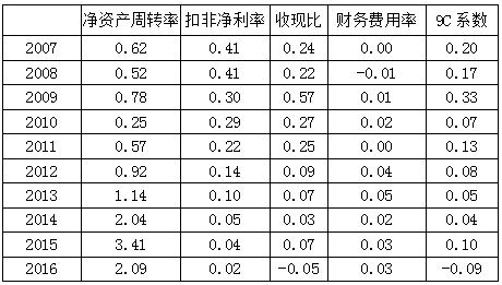 根据以上数据,我们计算出它的净资产周转率、扣非净利率、收现比、财务费用率。然后,再计算出9C系数。