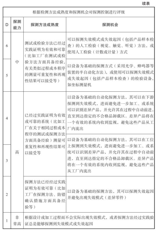 探测度就是用测量或实验设备检测失效模式的有效性。如果能检测,分数低;检验不了,只能通过间接手段或过程审核手段来确定是否是良品,分数就高。经过验证是有效的测量设备,分数一般在6分或以下,人工检验分数高,全自动检验分数低。如表2-8所示。