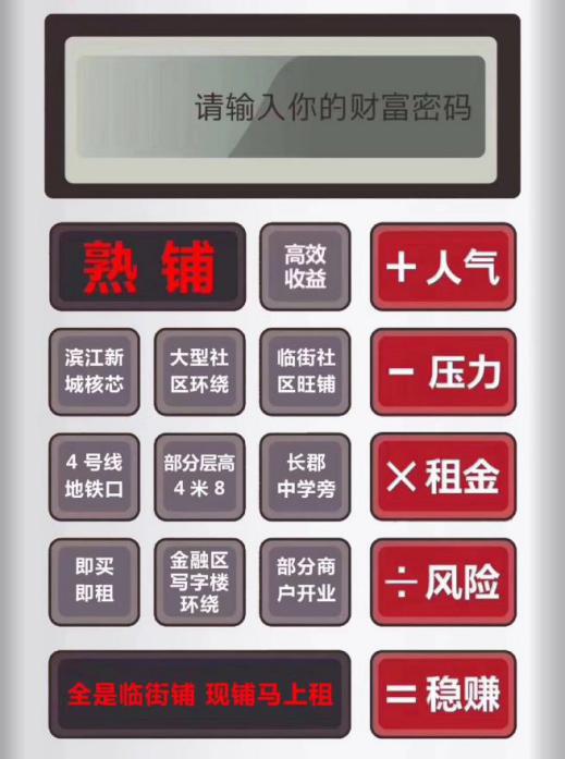 计算器涵盖了项目的12大卖点,真是算来算去都划算!不过也要提两点小建议供读者们借鉴:部分卖点可以整合,如将“临街社区旺铺”“即买即租”改成别的卖点,只需要留下非常突出的“全是临街铺 现铺马上租”这一句,这样更显精炼,避免语言繁复和卖点词穷之感。还有计算器显示屏文案“请输入你的财富密码”,想法不错但容易让人联想到“输入银行密码”,毕竟是一笔不小的投入,可能会让准客户产生不必要的戒备心理。建议换成:“算来算去都划算”或“请输入你的投资精算指数”可能更稳健一些。