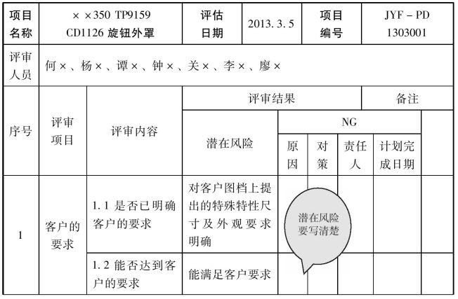 特殊特性主要包括产品和过程两种。产品特殊特性一般指原材料、半成品、成品本身表现出的特殊,如拉力、尺寸等。过程特殊特性一般从设备、工装、环境等方面表现出来,如成型参数、仓储温湿度等。特殊特性一般要用客户指定符号标示,如无客户指定符号,公司APQP程序中要明确特殊特性的符号,很多企业用“▲”表示。特殊特性如果由自己公司识别,APQP小组成员则要参与评审,并签字同意。如表1-2-4所示:
