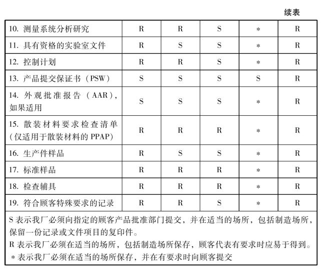 5.7 记录与标准样品之保存:对于每一次提交,公司都应保存一份完整的结果记录和标准样品,包括SPC结果。记录应显示符合所有尺寸、化学、物理及其他测试的规范,此记录包括下列文件之副本: