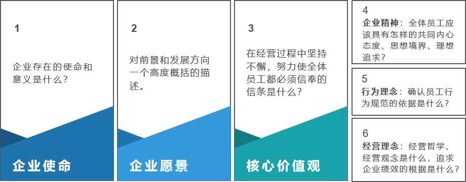 基于文化理念体系的划分方法有很多,如战略理念、价值观理念、执行理念等。笔者结合多年的企业文化管理咨询和实践经验,由繁入简,将文化理念模型划分为三个部分:使命、愿景、价值观。如图2-2所示。