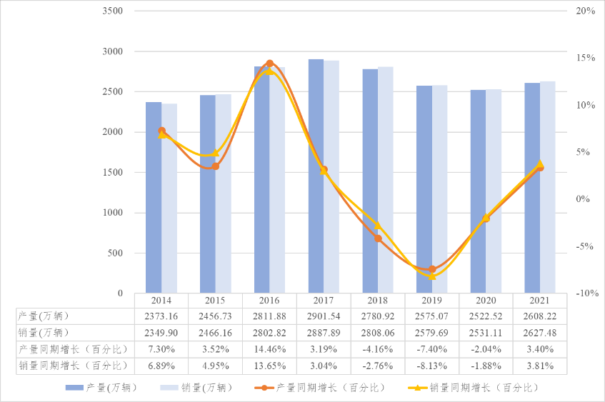 图1.1 2014~2021年我国汽车产销量及同期增长率(单位:万辆/%)