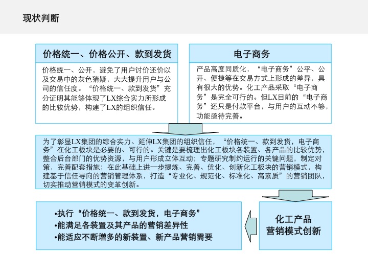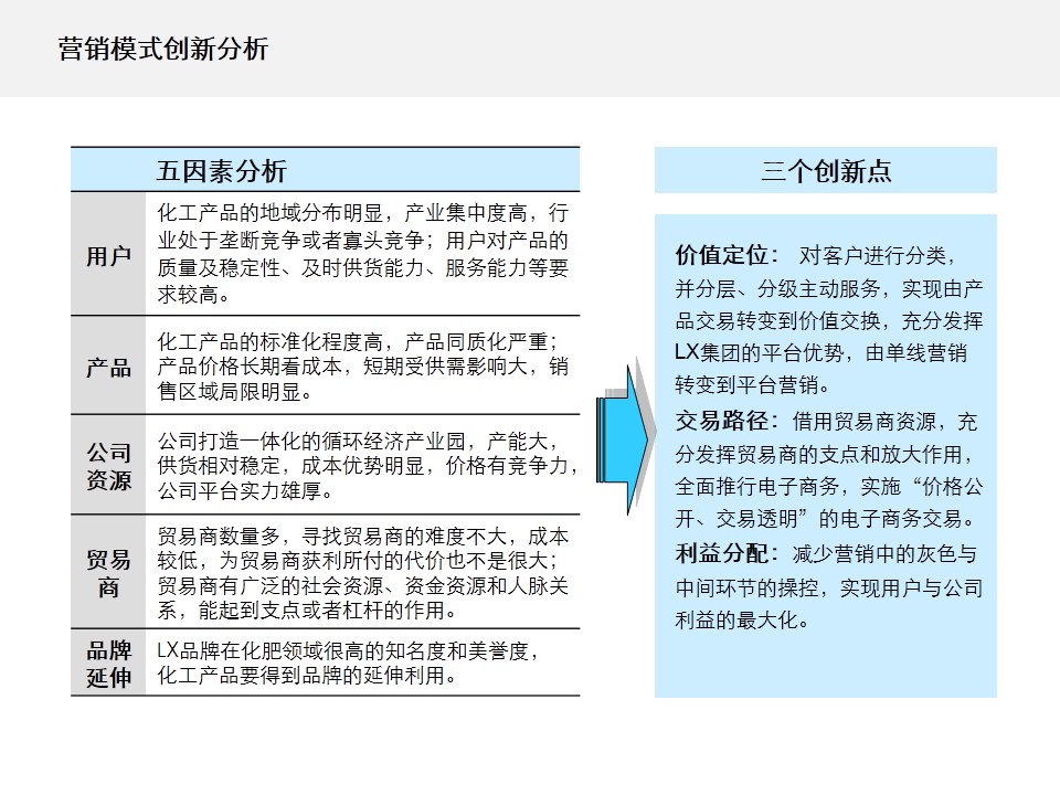 通过对公司营销现状的梳理、化工行业关键成功因素的分析、用户的“三者分析”、营销模式创新五因素和三个创新点的分析,LX进行了营销模式的创新。主要内容如下。