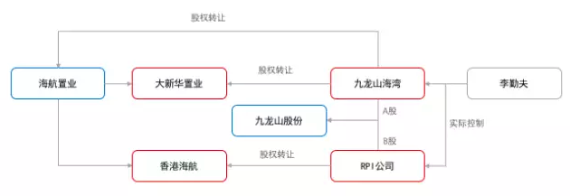 2011年3月7日,海航置业、上海海航大新华置业有限公司、香港海航置业控股(集团)有限公司以总计16.53亿元收购了李勤夫及其关联公司持有的九龙山A、B股合计3.9亿股,占九龙山总股本的29.9%,海航系由此成为九龙山第一大股东。如图11-1所示。