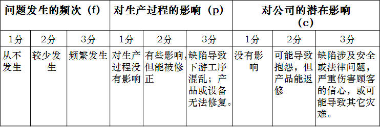 危险与可操作性评估(HAZOP):优先顺序数R=f×p×c,当R≥4时建议考虑运用防错方法进行控制,当R≥12时应立即防错。