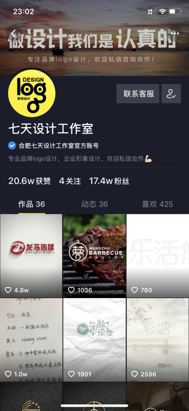 有一个做设计的账号“七天设计工作室”(图7-5),通过分享每一个LOGO设计的过程,让粉丝感到敬佩,进而产生咨询交流。对方会引导粉丝到微信交流,进行转化,效果很不错。不过,抖音在封杀微信,在留言沟通时,尽量不要提“微信”两个字,可以巧妙暗示。