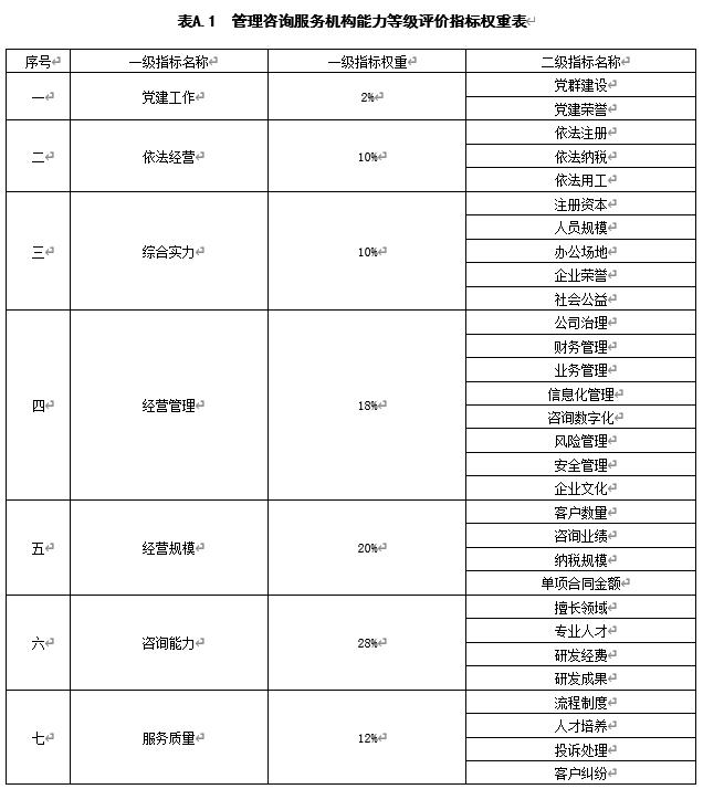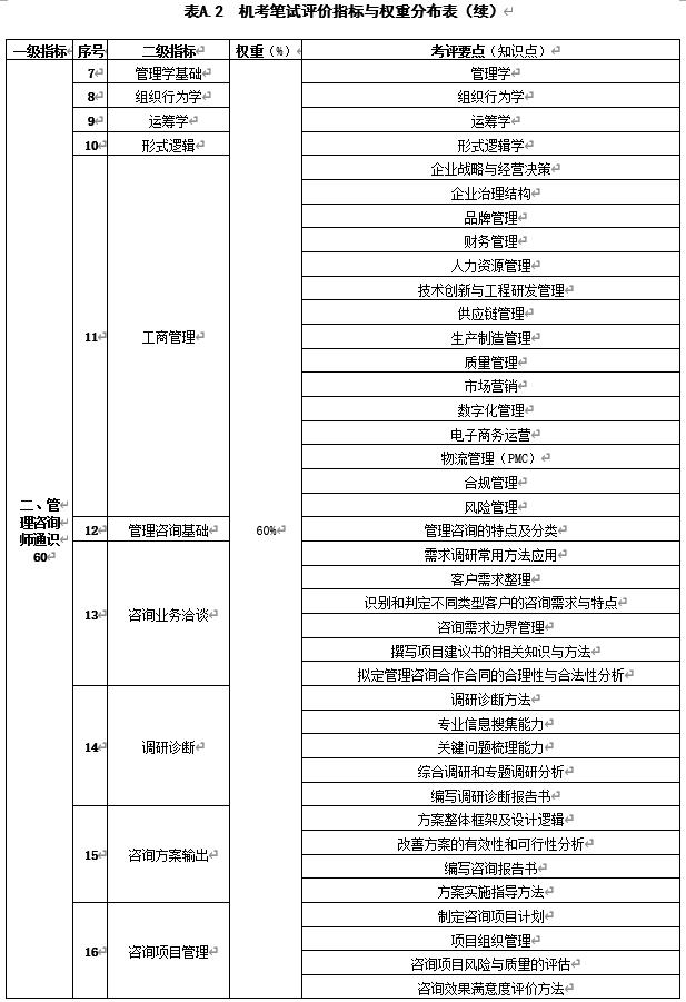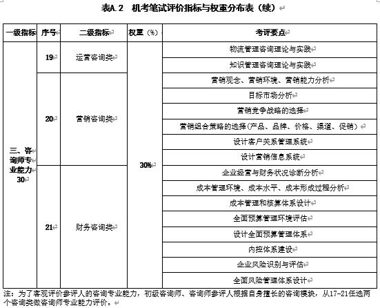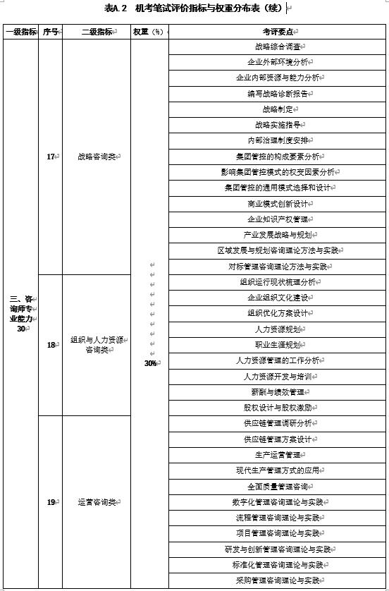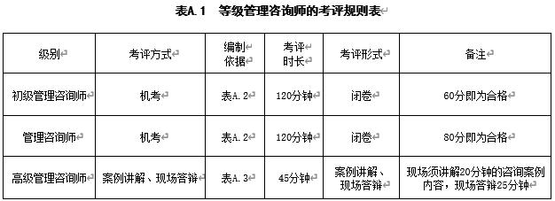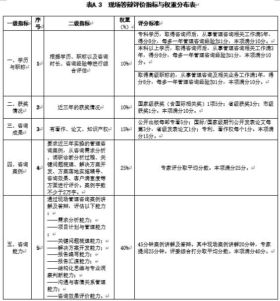为了评价管理咨询师是否达到所申请等级的咨询理论和实践水平,具备相应等级的职业咨询能力,评价机构应依本细则表A.2和表A.3所载的8项内容(涵盖了管理咨询师基本职业素养、管理咨询师通识、咨询师专业能力;学历与职称、获奖情况、咨询成果、咨询案例、咨询能力)进行评价,然后采用机考或现场答辩评审两种方式对评价对象进行能力评价。