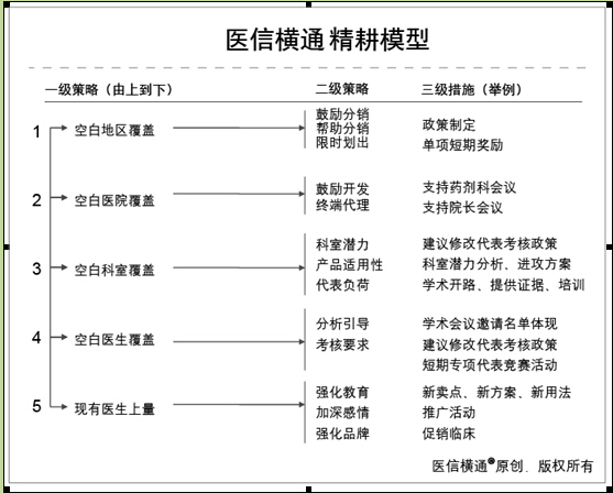 市场人员怎么办?重点考虑“医信横通精耕模型”一级策略的第3、第4和第5条。可能有的销售人员或代理商的代表说“我所有的科室都覆盖了!”不要轻信,他讲的覆盖和我们要求的覆盖相差很远。
