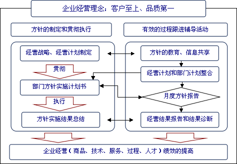 方针管理就是经营者的PDCA,它通常包括长期经营方针、中期经营方针、年度经营计划及各部门的实施计划四个层次的内容。为适应快速变化的经营环境,有些企业将长期方针和中期方针合二为一,做成一个中长期方针。
