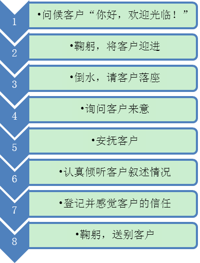 除此之外,还有各个环节的详细流程。接待员工作流程如图1-2所示。