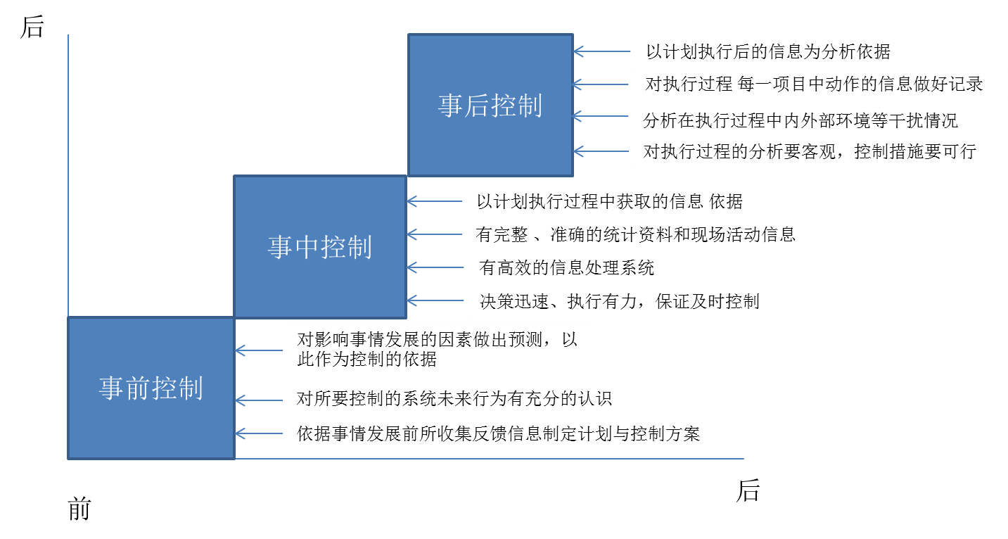 这是一种从时间维定义管理活动的方法。事后控制与事中控制都是使用负反馈控制原理,事前控制则使用的是前馈控制原理。